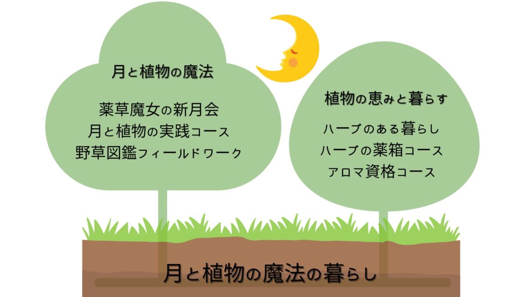 フルフルでは、月と植物がもたらす魔法を暮らしに取り入れ、自分らしく生きる力を一緒に育んでいきたいと、「月と植物の魔法」「植物の恵みと暮らす」2つの幹から広がるクラスを提案しています。